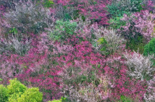 在这里,数不胜数的花竞相开放,仅桃花就涵盖23个品种,粉的、白的、粉白相间的花朵错落交织,搭配上梨花、樱花、李子花等各色花种点缀其间,织就出一幅五彩斑斓的春日画卷。依托龙骨山桃林,当地精心打造了伴山居精品民宿,20个造型各异的舱体民宿错落排布,搭配超大尺寸透明玻璃窗,将春日盛景尽数框入室内——赏花时节,游客身居屋中,白日可赏桃林叠翠、繁花缀岭,夜晚能观星空璀璨、晚风轻拂,沉浸式感受山水相依的田园之美。