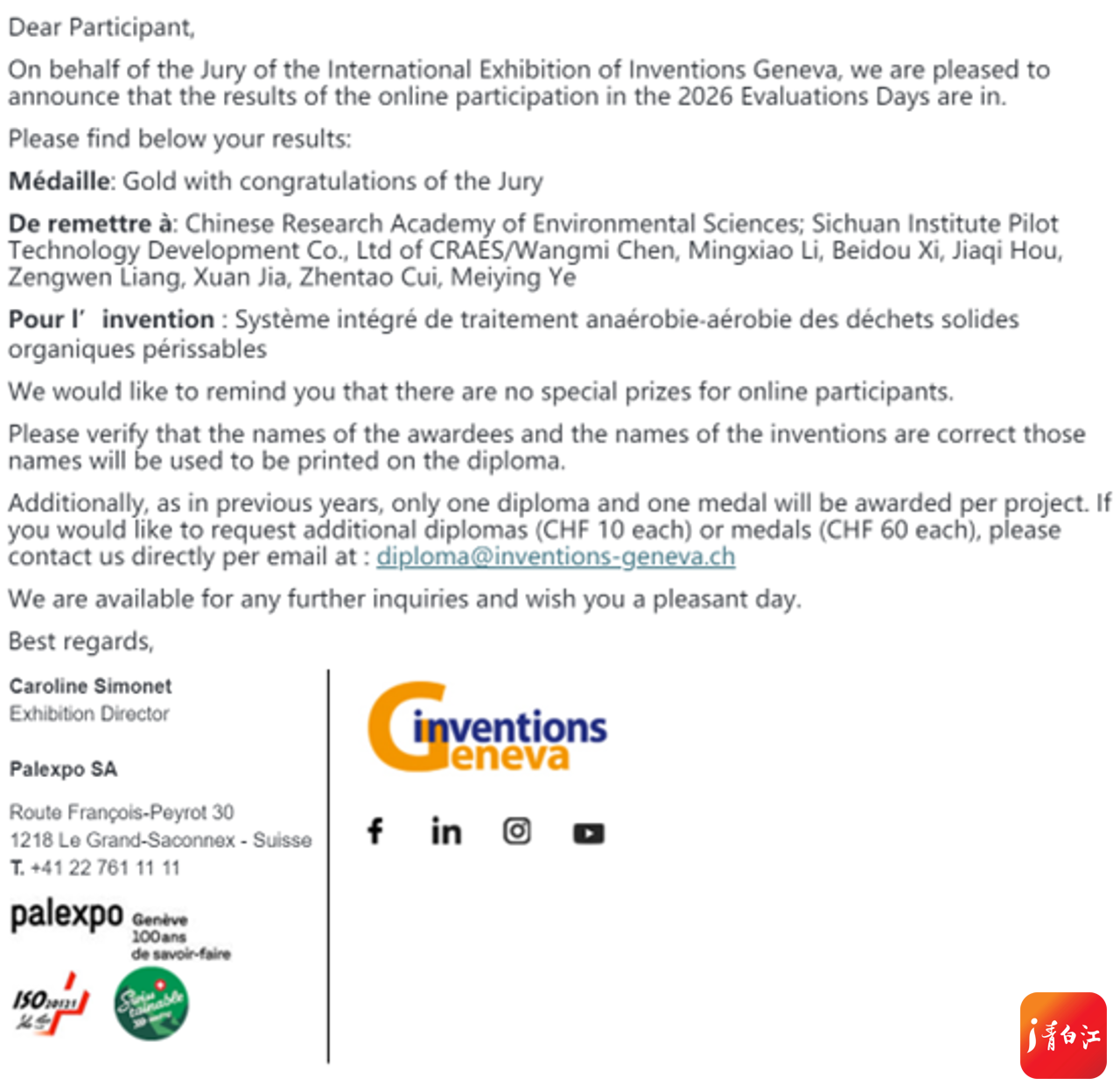 日内瓦国际发明展创办于1973年,由瑞士联邦政府、日内瓦州政府、日内瓦市政府及世界知识产权组织共同主办,是全球历史最悠久、规模最大的发明展之一,也是高新技术“产学研”转化的重要国际化平台。中国环境科学研究院西南中试产业基地落户于成都市青白江区,是西南地区固废资源化领域的重要创新策源地。