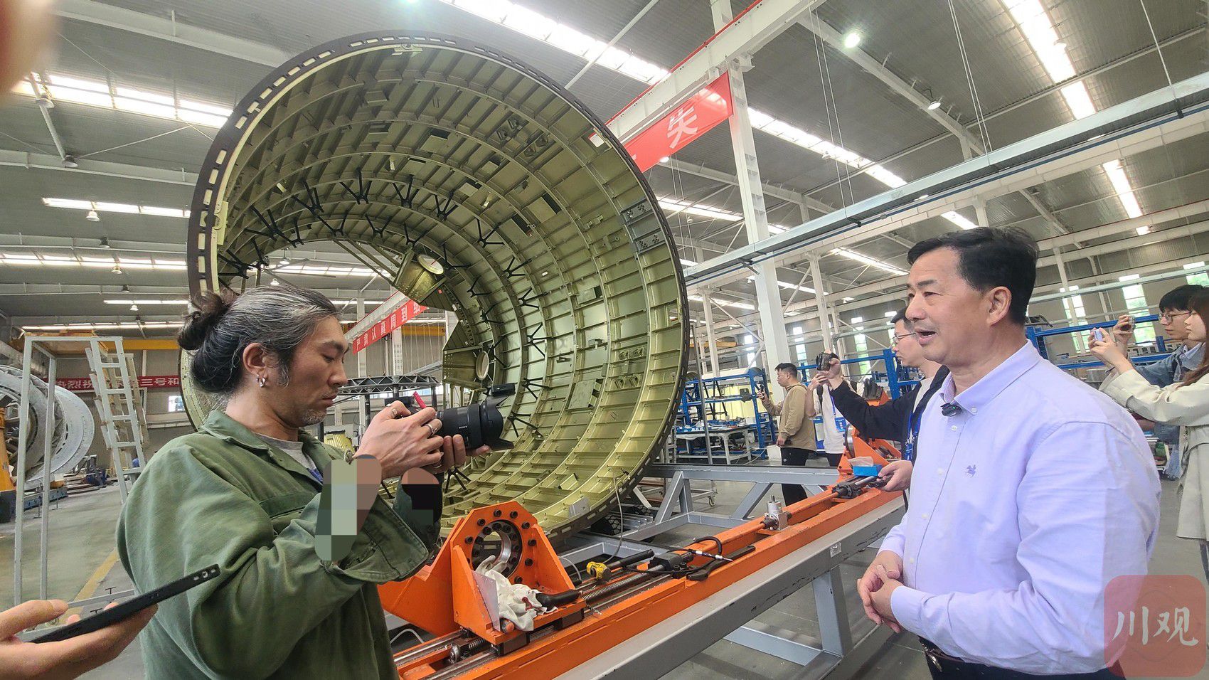 富江工业创始人李泽奇(右)在介绍正待验收的可回收火箭箭体。