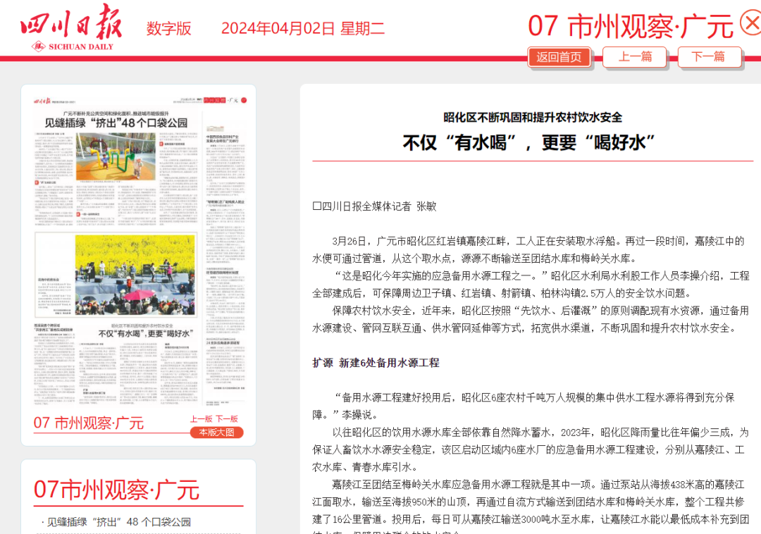 4月2日【四川日报】昭化区不断巩固和提升农村饮水安全 不仅“有水喝”,更要“喝好水”