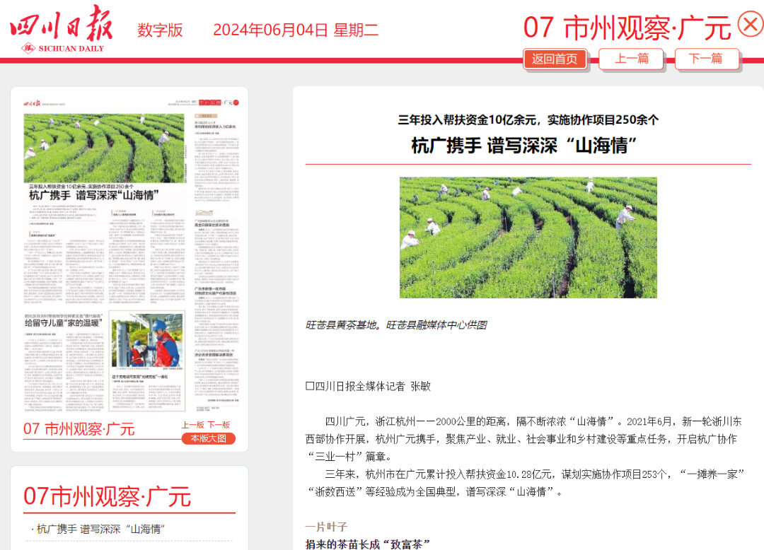 6月4日【四川日报】三年投入帮扶资金10亿余元,实施协作项目250余个 杭广携手 谱写深深“山海情”