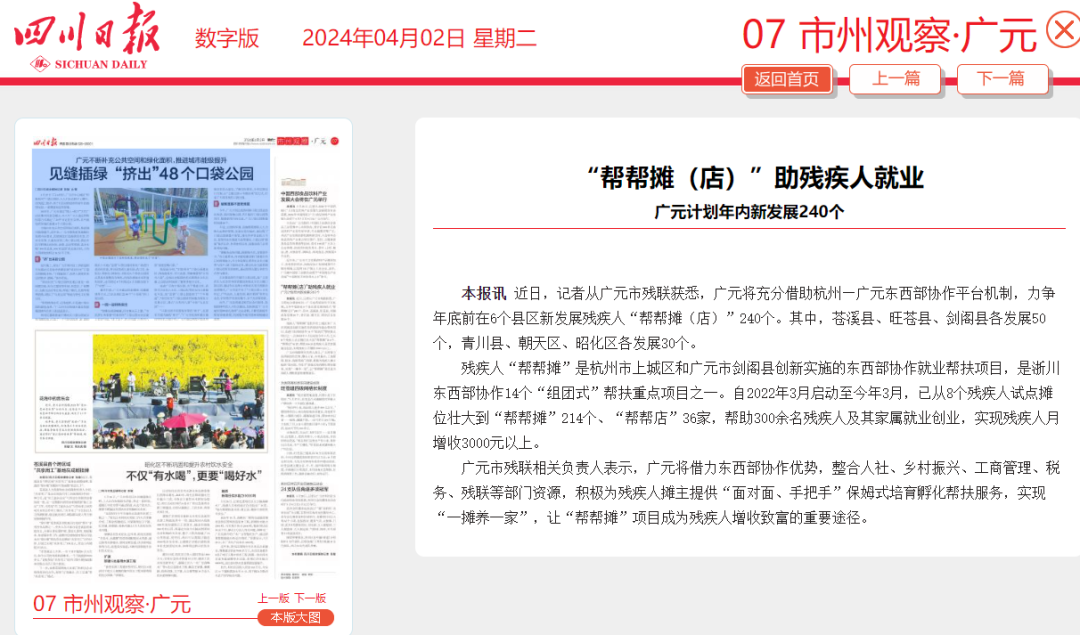 4月2日【四川日报】“帮帮摊(店)”助残疾人就业 广元计划年内新发展240个