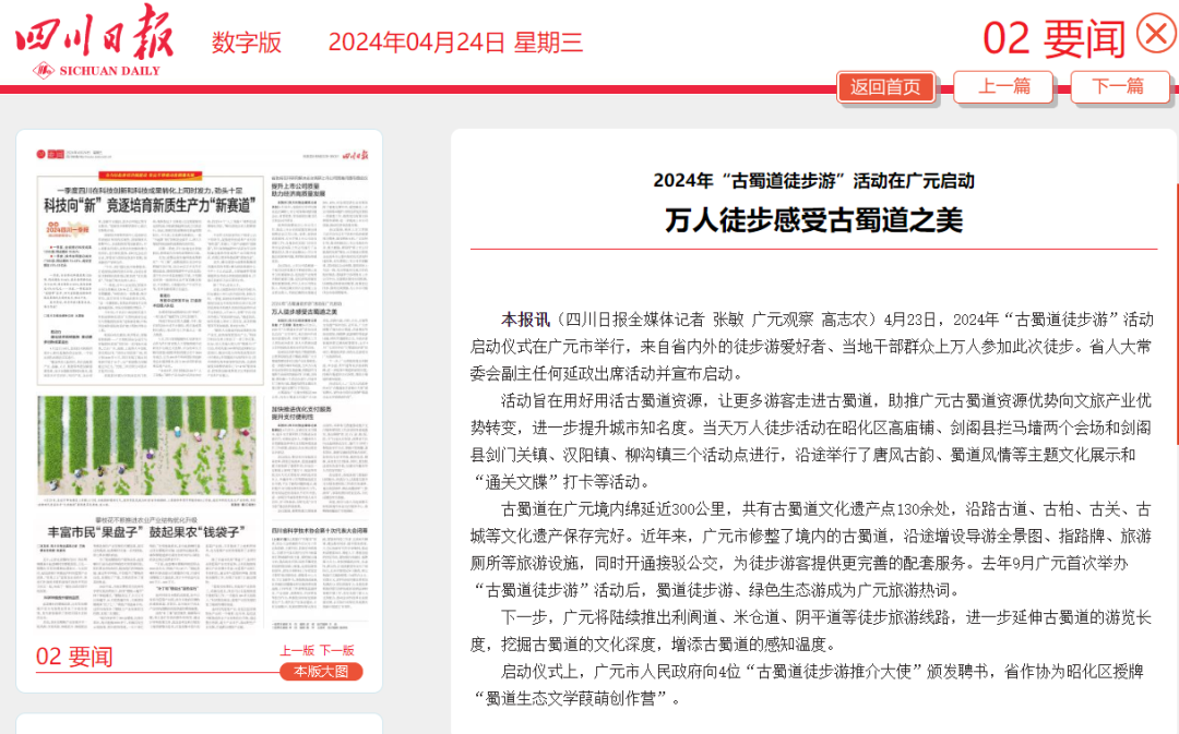 4月24日【四川日报】2024年“古蜀道徒步游”活动在广元启动 万人徒步感受古蜀道之美