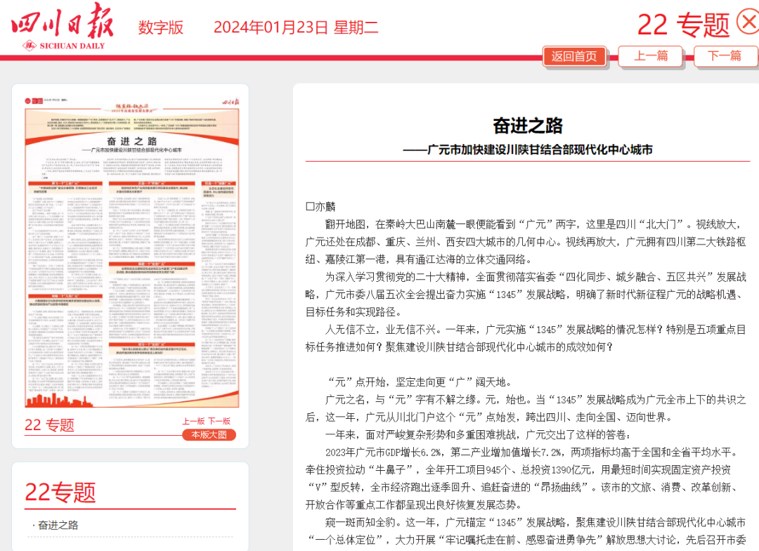 1月23日【四川日报】奋进之路 ——广元市加快建设川陕甘结合部现代化中心城市