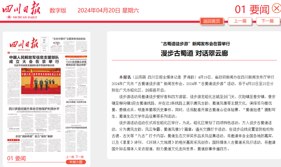 4月20日【四川日报(头版)】“古蜀道徒步游”新闻发布会在蓉举行 漫步古蜀道 对话翠云廊