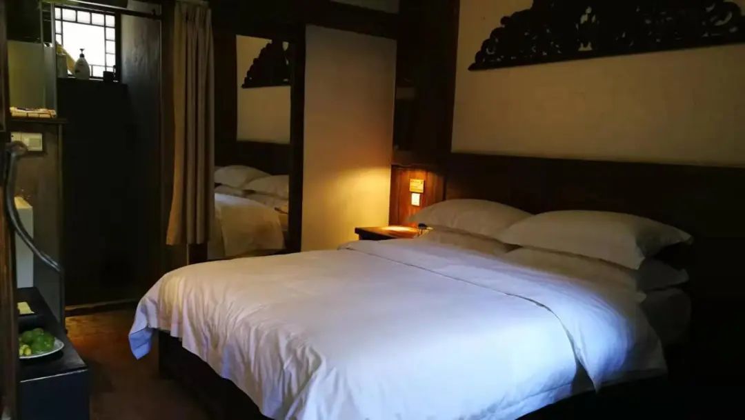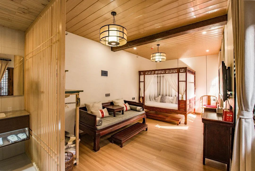 院内设有花园亲子、山景、街景等特色客房,每一间都独具匠心。室内装饰以木质家具为主,巧妙搭配钱柜、花瓶、古代砖瓦等老物件,营造出浓厚的历史文化氛围。