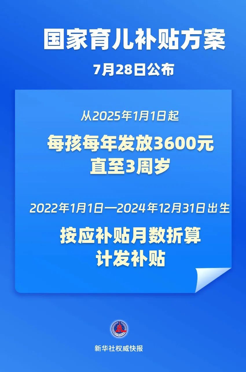 7月28日,国家育儿补贴制度实施方案公布,从2025年1月1日起,无论一孩、二孩、三孩,每年均可领取3600元补贴,直至年满3周岁。