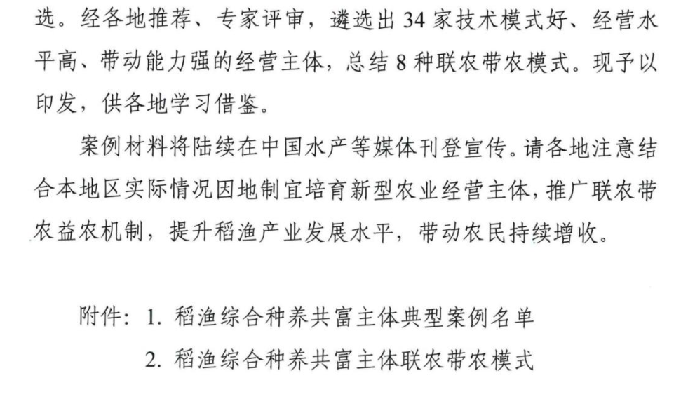 近三年来,该专合社通过稻渔综合种养的推进和实施,探索出以联农带农连接机制。以“专合社+基地+核心示范户+农户”的模式,与农户签定2元/斤的稻谷回收订单,结合水产品的销售,带动种养农户实现产品收益增收;通过向种养农户按每亩亩优质稻种100元、鱼种400元、有机肥料100元、统防统治70元的标准进行补助,带动农户增收;每年为流转土地农户支付土地流转和分红费用40余万元,支付当地300余名村民就地务工费用30余万元,带动农户增收。