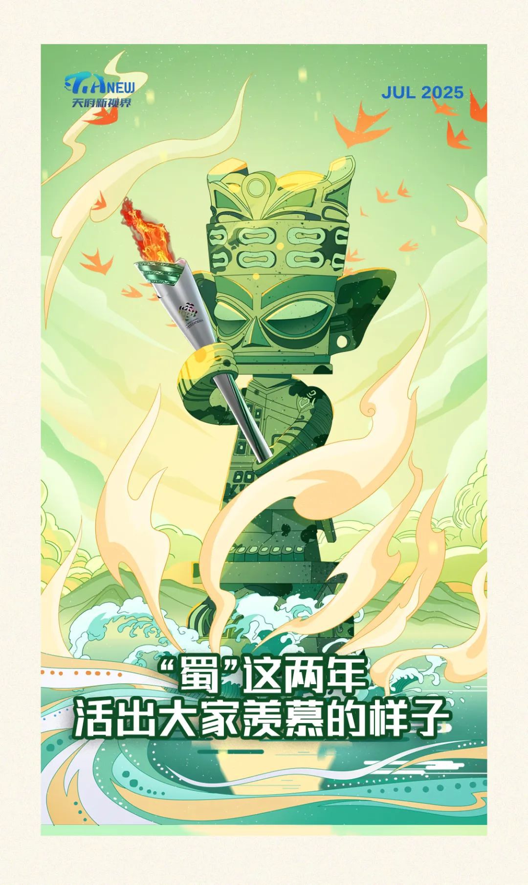 7月26日,成都世运会火炬传递将在三星堆博物馆举行。以三星堆出土青铜大立人为设计灵感的火炬“竹梦”,也以逐梦之火,照亮巴蜀大地的文化IP。