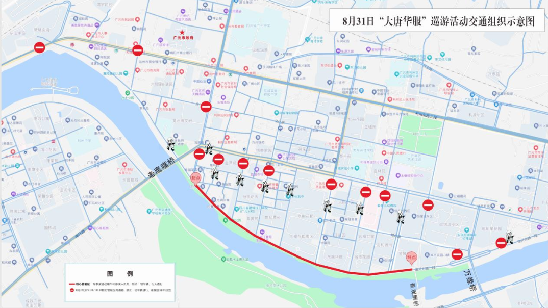 8月24日至9月1日,2025年广元女儿节暨欢乐文化周活动将在市城区举行,其中8月24日至30日举行“放歌嘉陵江”群众歌咏活动、8月30日至9月1日举行“曌动广元”群众巡游活动、9月1日举行2025年广元女儿节开幕式和女儿节之夜活动。为保障系列活动期间城市道路交通安全畅通有序,根据《中华人民共和国道路交通安全法》的相关规定,交管部门将对市城区相关路段实施临时交通管制。