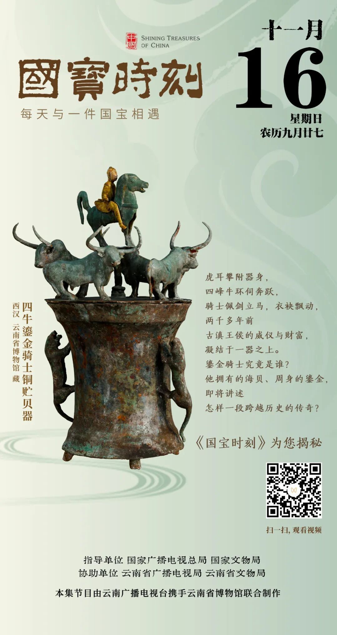 虎耳攀附器身,四峰牛环伺奔跃,骑士佩剑立马,衣袂飘动,两千多年前古滇王侯的威仪与财富,凝结于一器之上。鎏金骑士究竟是谁?他拥有的海贝、周身的鎏金,即将讲述怎样一段跨越历史的传奇?《国宝时刻》为您揭秘!来源:视听中国