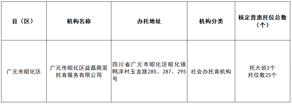 根据市卫生健康委员会、市发展和改革委员会、市教育局、市财政局、市市场监督管理局《关于印发〈广元市普惠托育服务机构认定及补助实施细则(试行)〉的通知》(广卫发〔2025〕14号)要求,经备案托育机构自愿申报,2025年12月25日至12月29日,昭化区卫生健康局、昭化区发改局、昭化区教育局、昭化区财政局、昭化区市场监管局和昭化区应急管理局、昭化区疾控中心、昭化区妇幼保健院、昭化区消防大队等专家联合组成认定工作组,对申报机构的资质、条件、收费、管理等进行审核查验,现将广元市昭化区益昌萌茁托育中心拟认定的普惠托育服务机构和普惠托位总数予以公示。