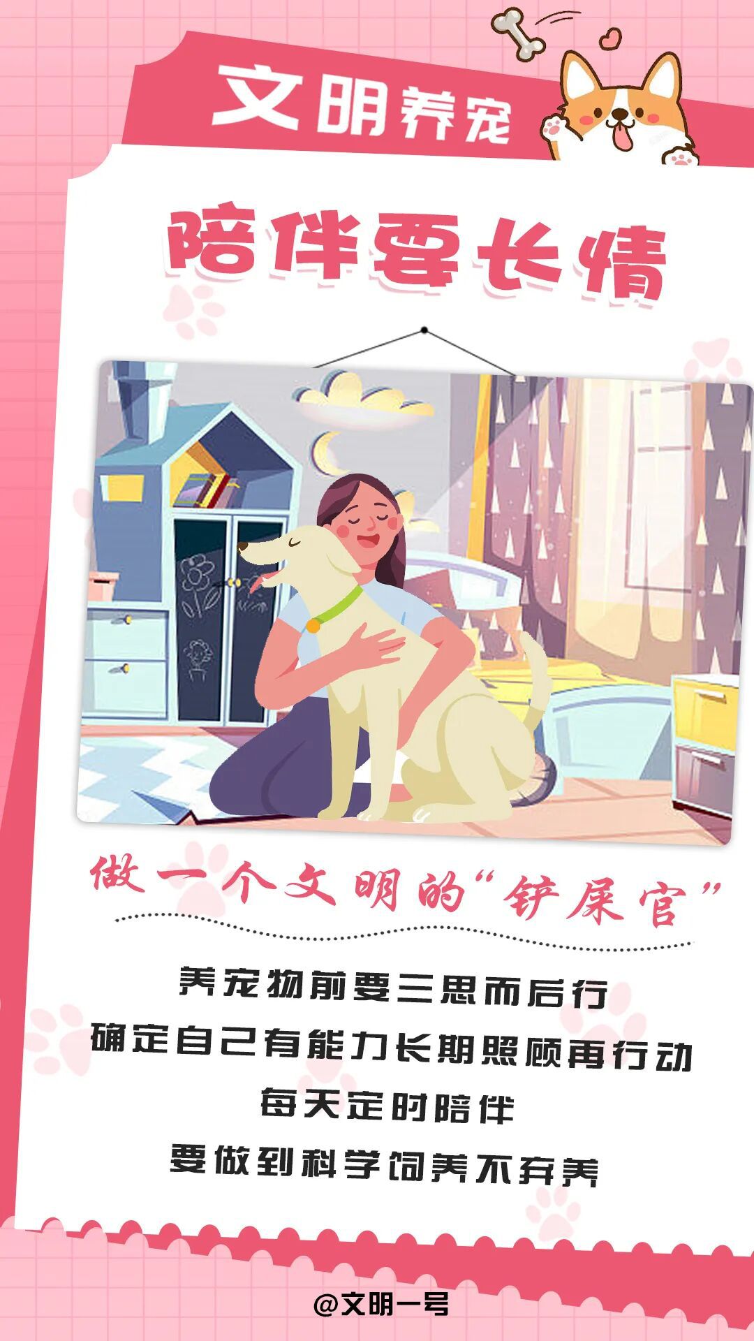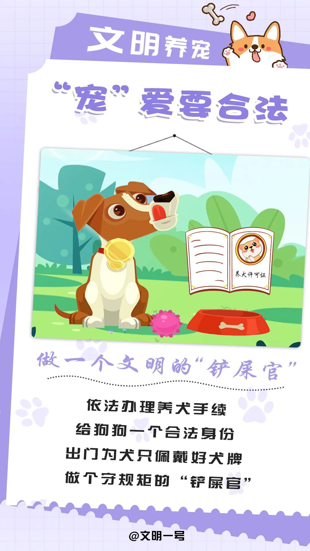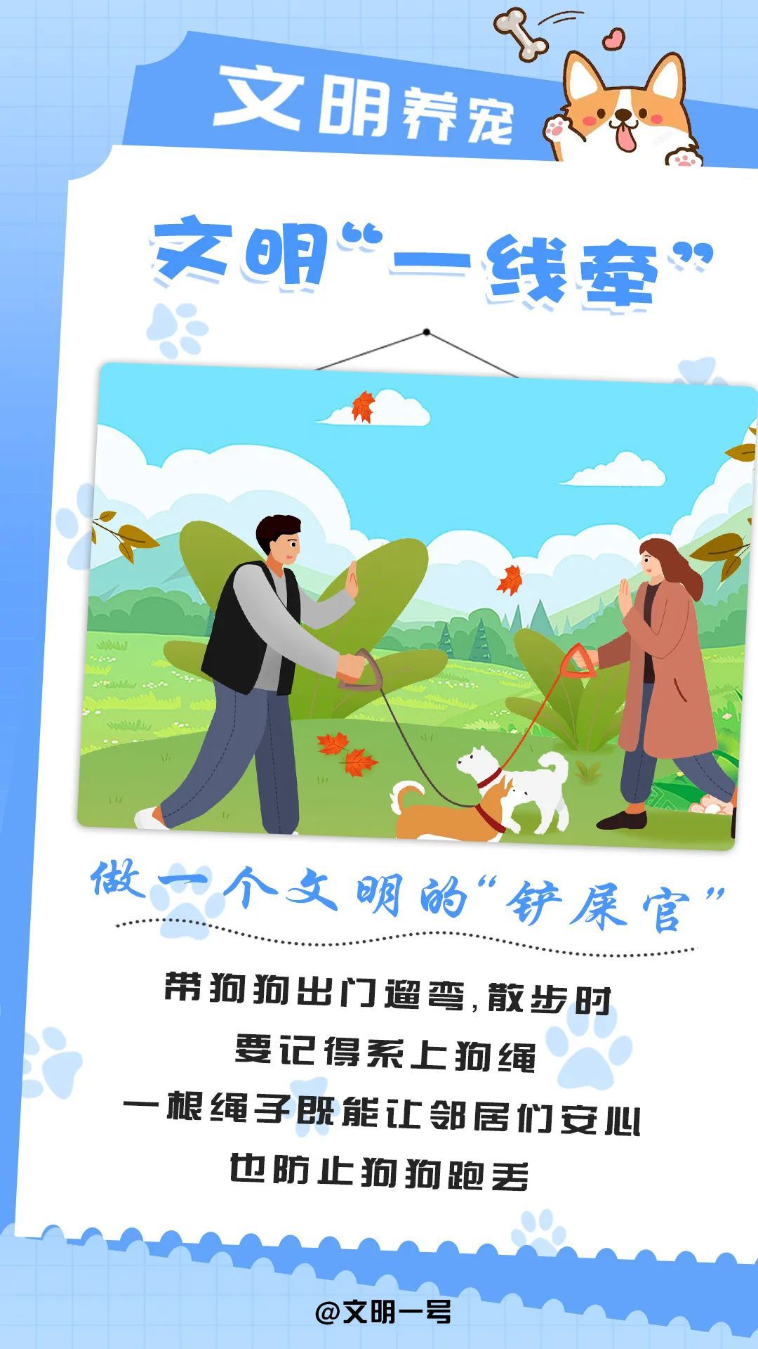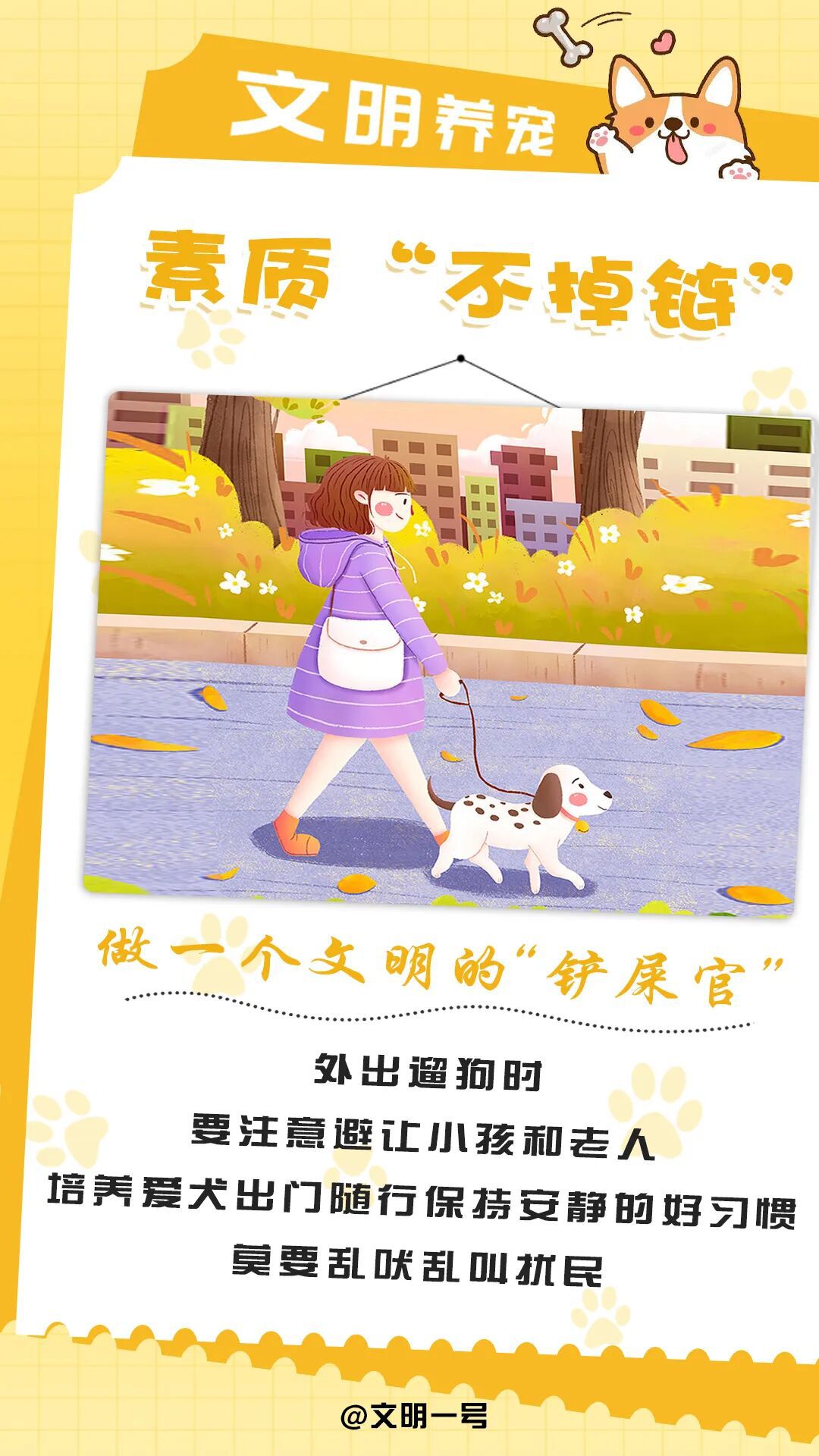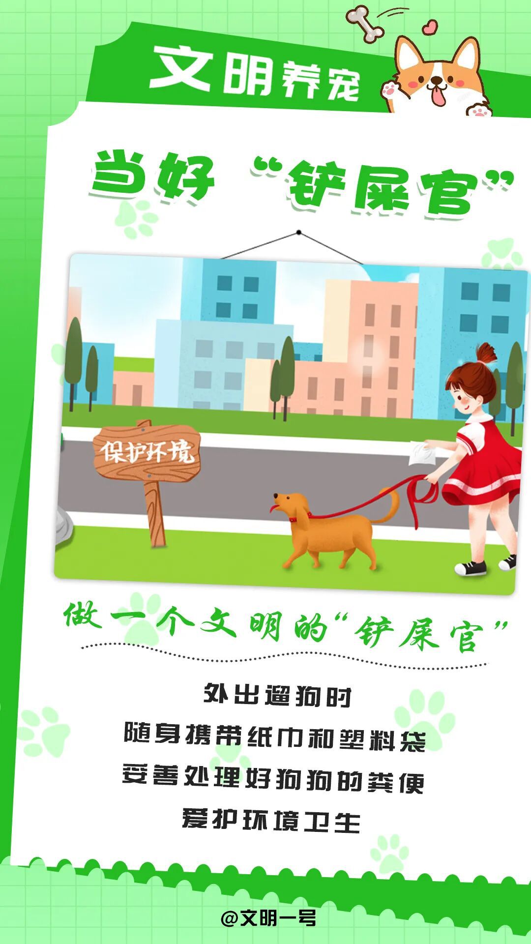 狗狗是我们人类的好朋友是很多养犬人心中的重要家庭成员它带来了无数的快乐但与此同时一些不文明的养宠行为也为身边人带来困扰遛狗不牵绳的危险狗狗随地大小便污染环境......养犬者既然收获了养犬的快乐就要承担起文明养犬的责任!“宠”爱有方做一个文明的“铲屎官”享受爱犬带来快乐的同时就要承担起养犬责任文明养宠用自己的实际行动为爱犬赢得一份尊重来源:文明一号