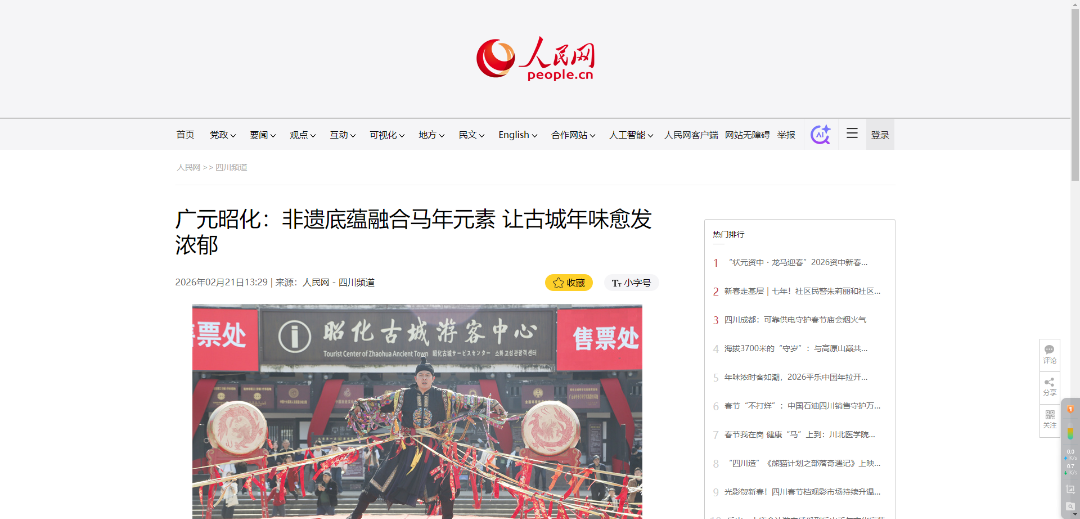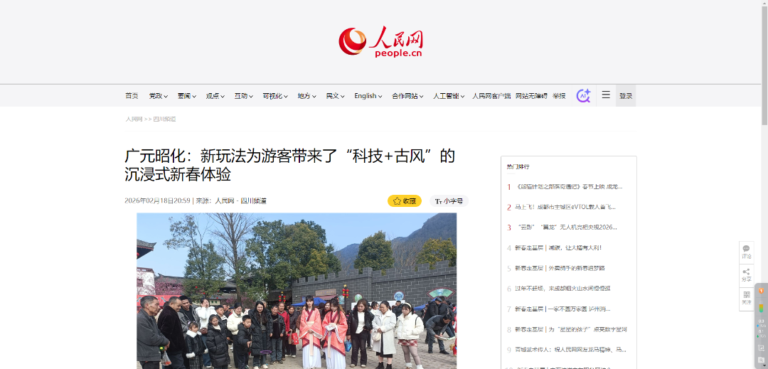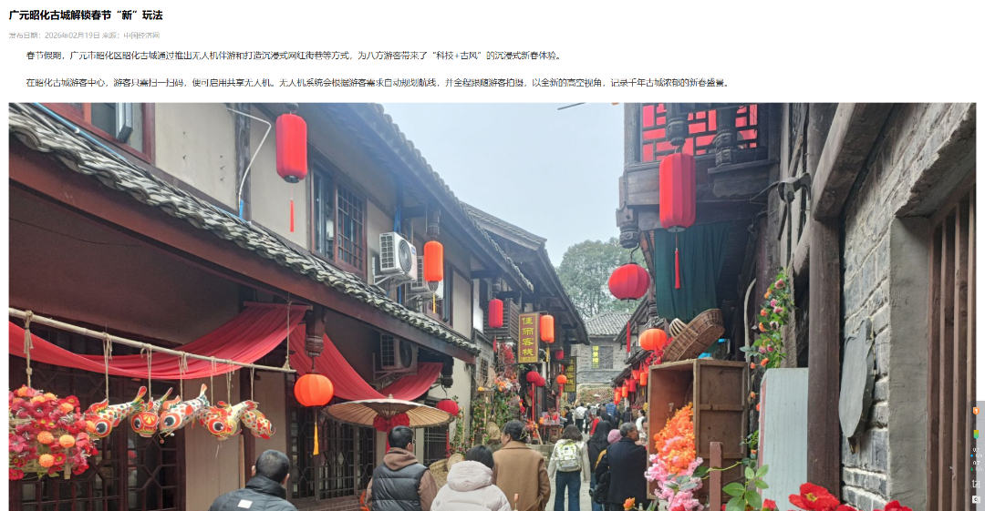 媒体联动造势,中央电视台、人民网、四川电视台等报道或发布宣传文章、视频超130次。中央电视台新闻频道报道《沉浸式逛昭化古城 感受古今交汇魅力》,直播连线昭化古城,全方位展现古城的新春风貌;人民网专题报道“昭化“科技+古风”沉浸式体验”,提升品牌知名度;四川卫视报道《巴山蜀水春意浓 欢腾祥和庆新春》;射箭提阳戏在四川春晚亮相,展现了昭化非遗文化的深厚底蕴,持续拓宽我区文化旅游宣传推广覆盖面,有效提升知名度和美誉度。
