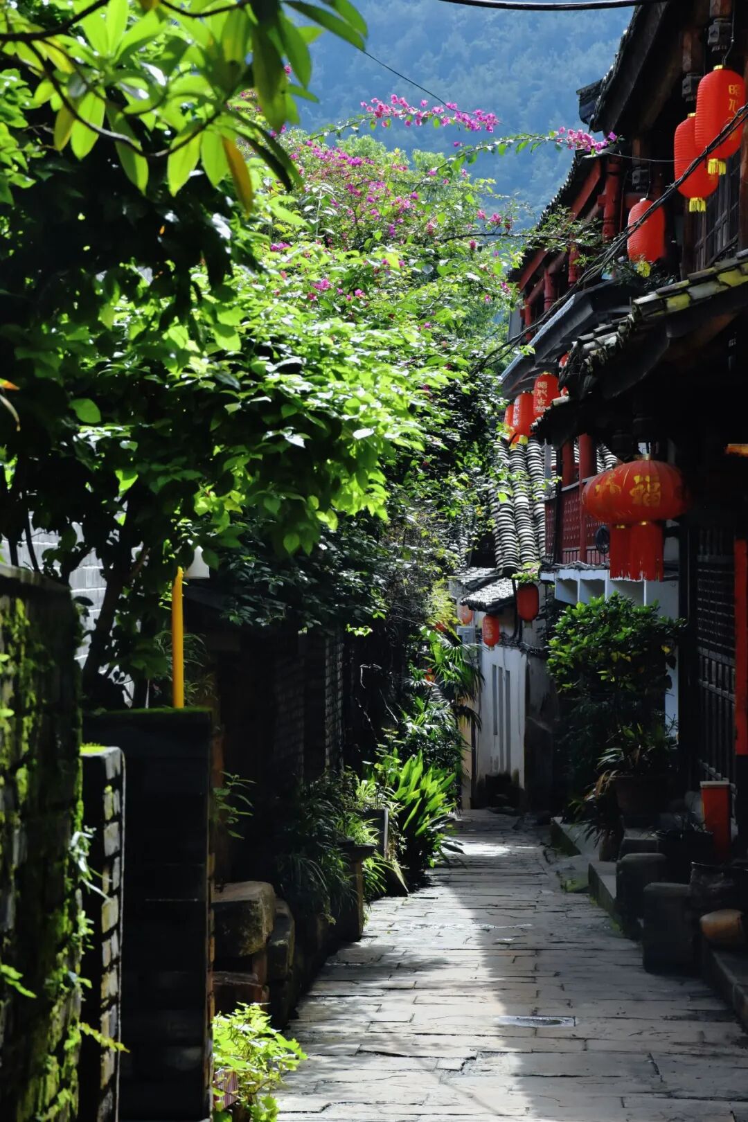 古城的『深幽小巷』里,两边古宅前后花草繁茂,院墙上,三角梅似花瀑一般,艳紫色点缀着青砖灰瓦的巷弄,与悬挂的大红灯笼相映成趣。在暖阳的照射下,恍惚间像是时光也浸了蜜、染了香。