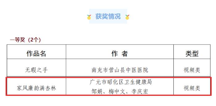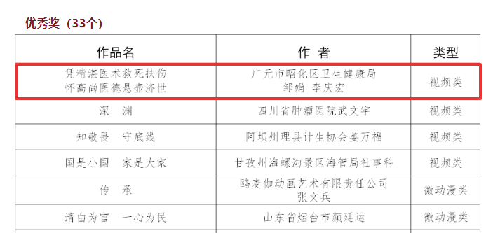 昭化区《家风廉韵满杏林》《凭精湛医术救死扶伤 怀高尚医德悬壶济世》荣获廉洁文化(家教家风)公益广告天府好家规“好风传家”短视频一等奖和优秀奖。