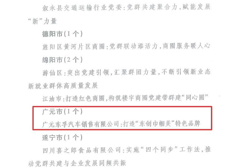 昭化区《广元东孚汽车销售有限公司:打造“东创巾帼美”特色品牌 》被评为四川省两新组织党建带群建创新案例。(全市唯一)