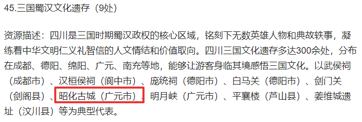 嘉陵江昭化曲流 、昭化古城 、四川傩戏(射箭提阳戏)入选四川省第一批中国特品级旅游资源推荐名录。