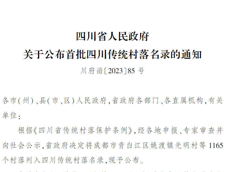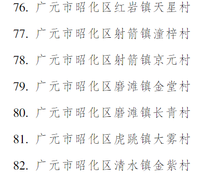 昭化区柏林沟镇向阳村、柏林沟镇双龙村、元坝镇柳桥村、元坝镇云雾村、昭化镇城关村、昭化镇大朝驿村、昭化镇牛头村、红岩镇天星村、射箭镇潼梓村、射箭镇京元村、磨滩镇金堂村、磨滩镇长青村、虎跳镇大雾村、清水镇金紫村、太公镇太公岭村、青牛镇苏山村 、卫子镇狮子村 、卫子镇石井铺村、王家镇方山村 、红岩镇照壁村入选首批四川传统村落名录。