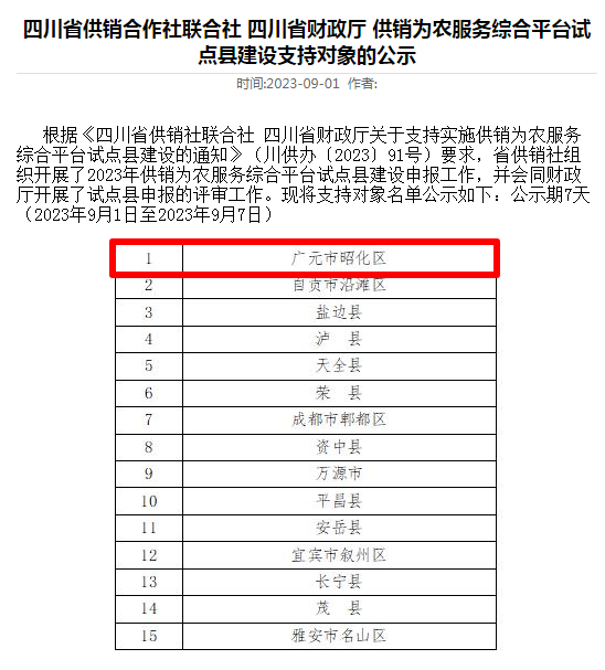 昭化区被评为四川省供销为农服务综合平台试点县建设。(全省第一)