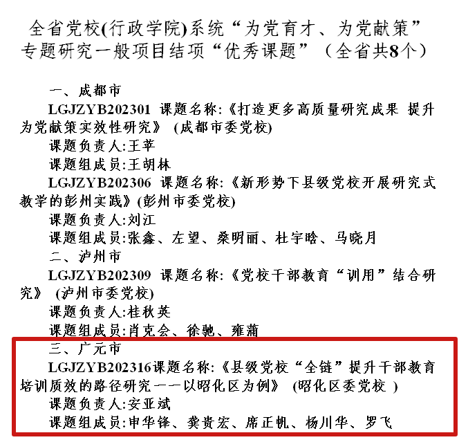 昭化区《县级党校“全链”提升干部教育培训质效的路径研究——以昭化区为例》荣获全省“优秀课题”。
