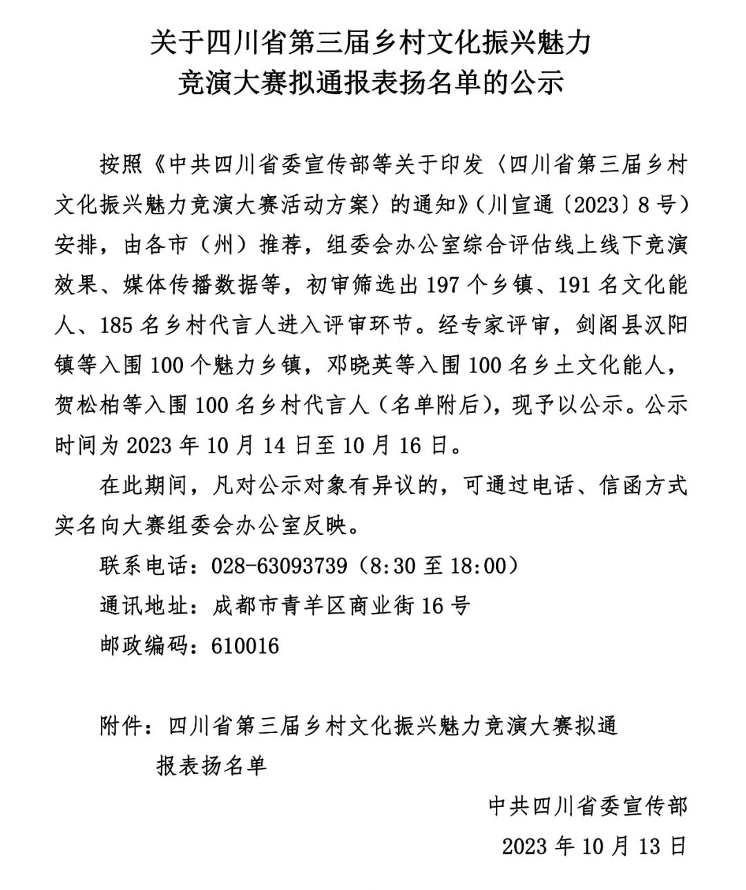 昭化区昭化镇 、李大富、熊娟、文宏获四川省第三届乡村文化振兴魅力竞演大赛通报表扬。