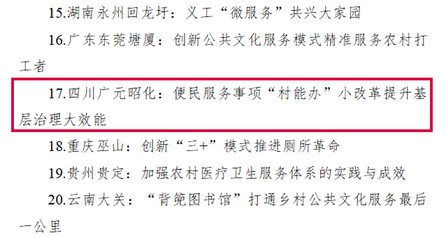 《广元昭化:便民服务事项“村能办” 小改革提升基层治理大效能》被评为第四批全国农村公共服务典型案例。(四川唯一)