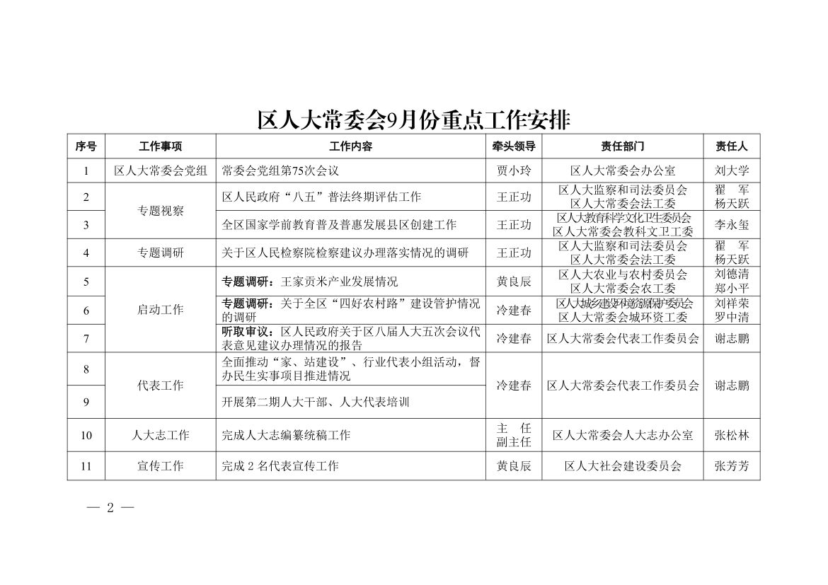 关于印发《区人大常委会9月份重点工作安排》的通知