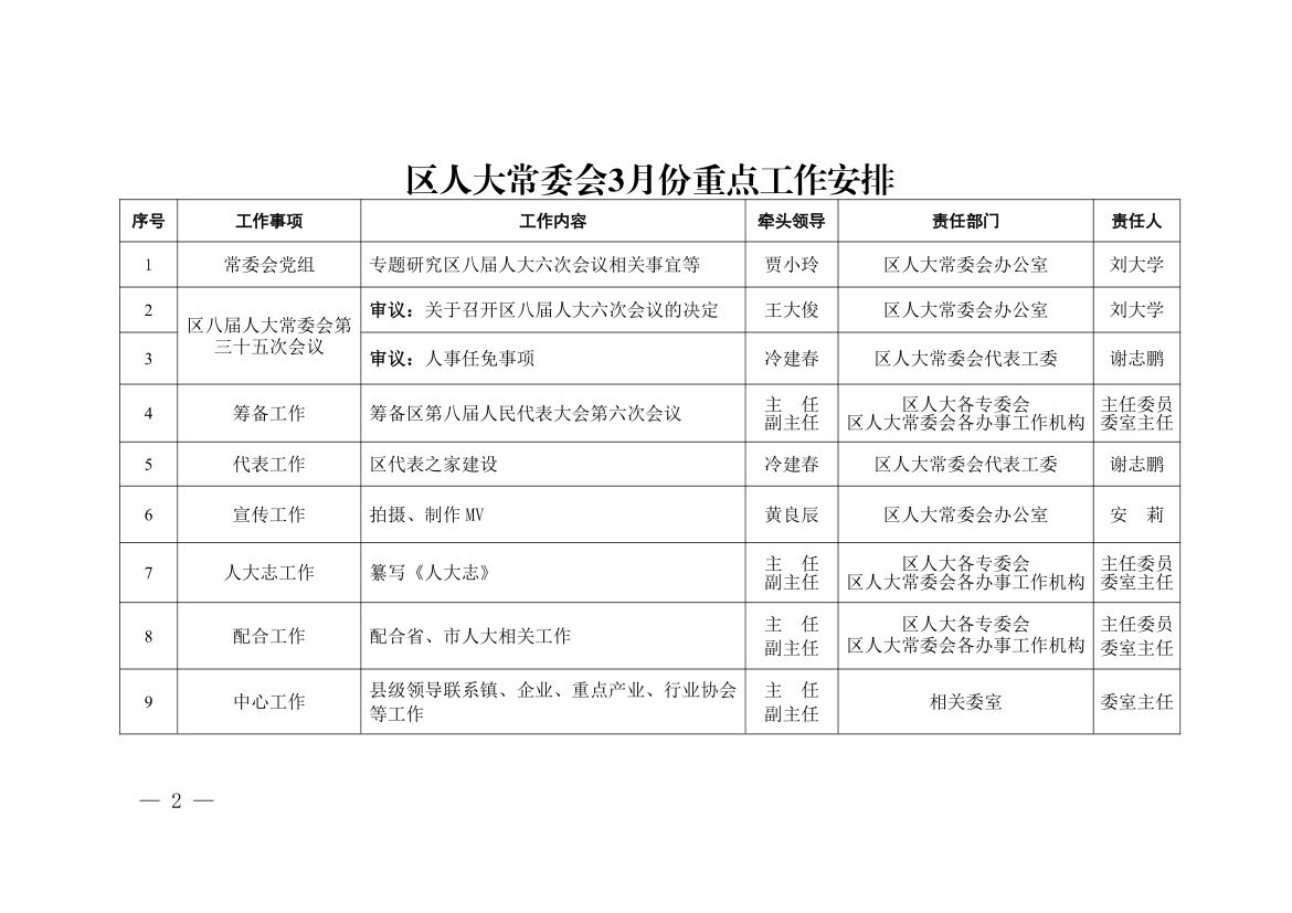 关于印发《区人大常委会3月份重点工作安排》的通知