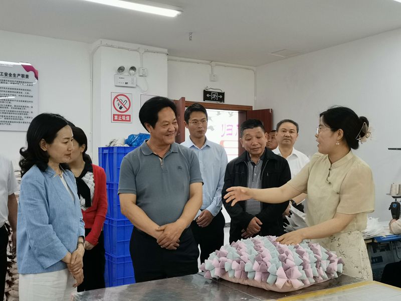 图为杨凯主任看望省人大代表肖华并调研“归雁工程”来料车间加工运行情况