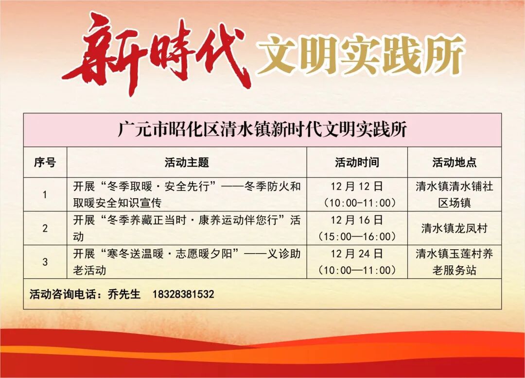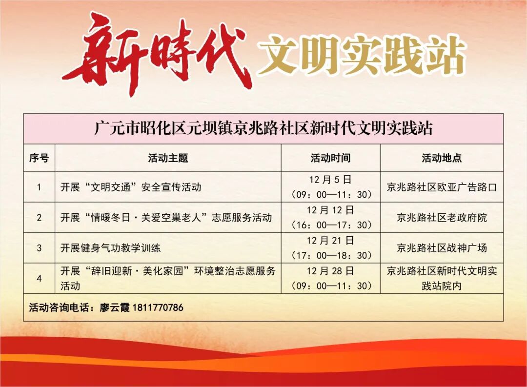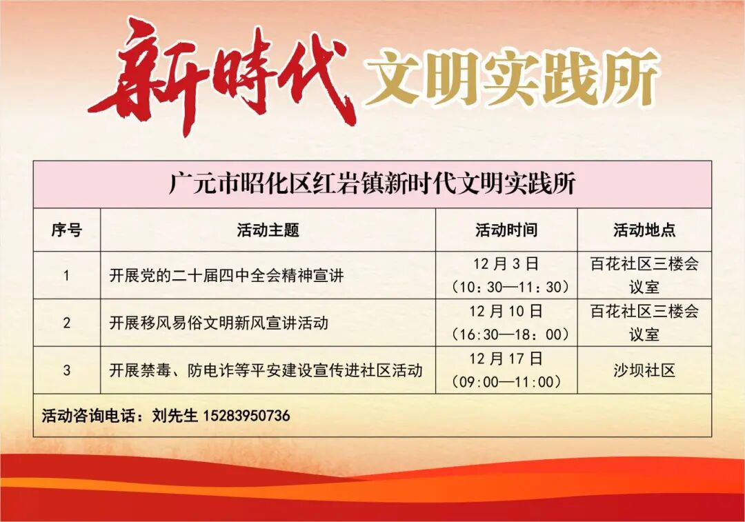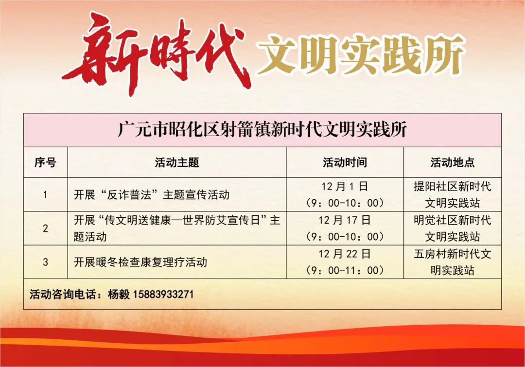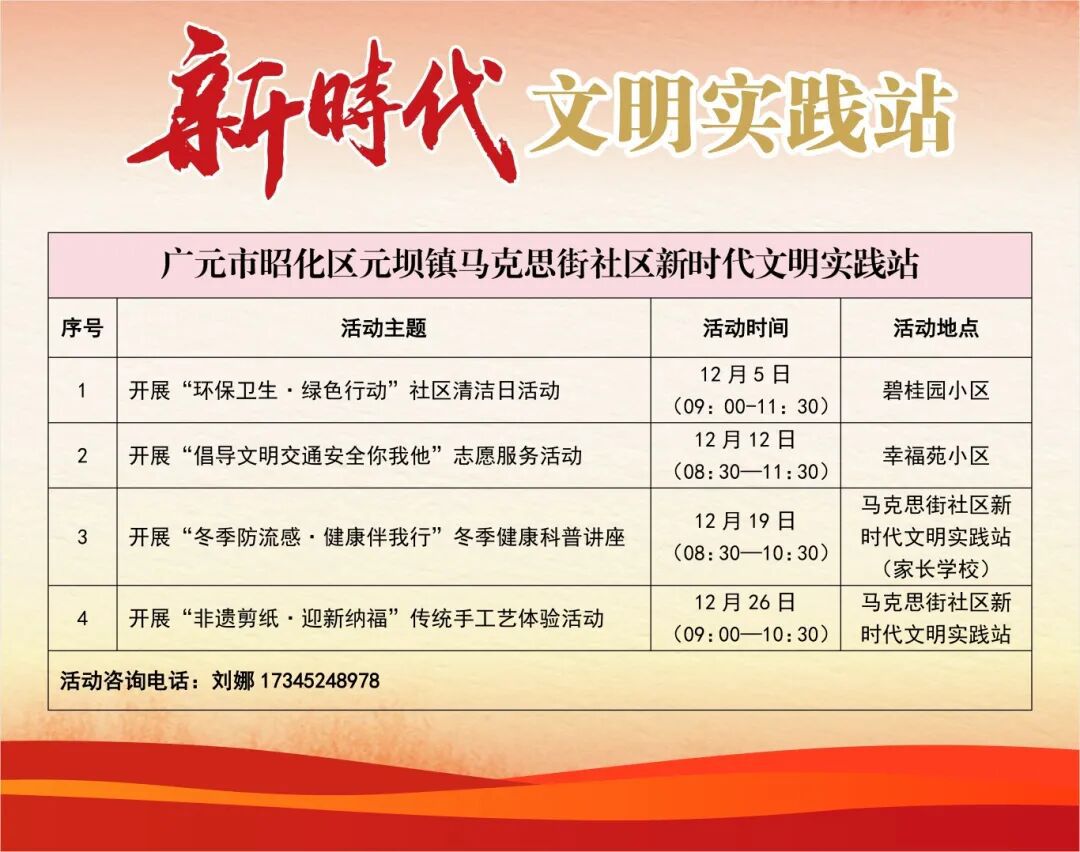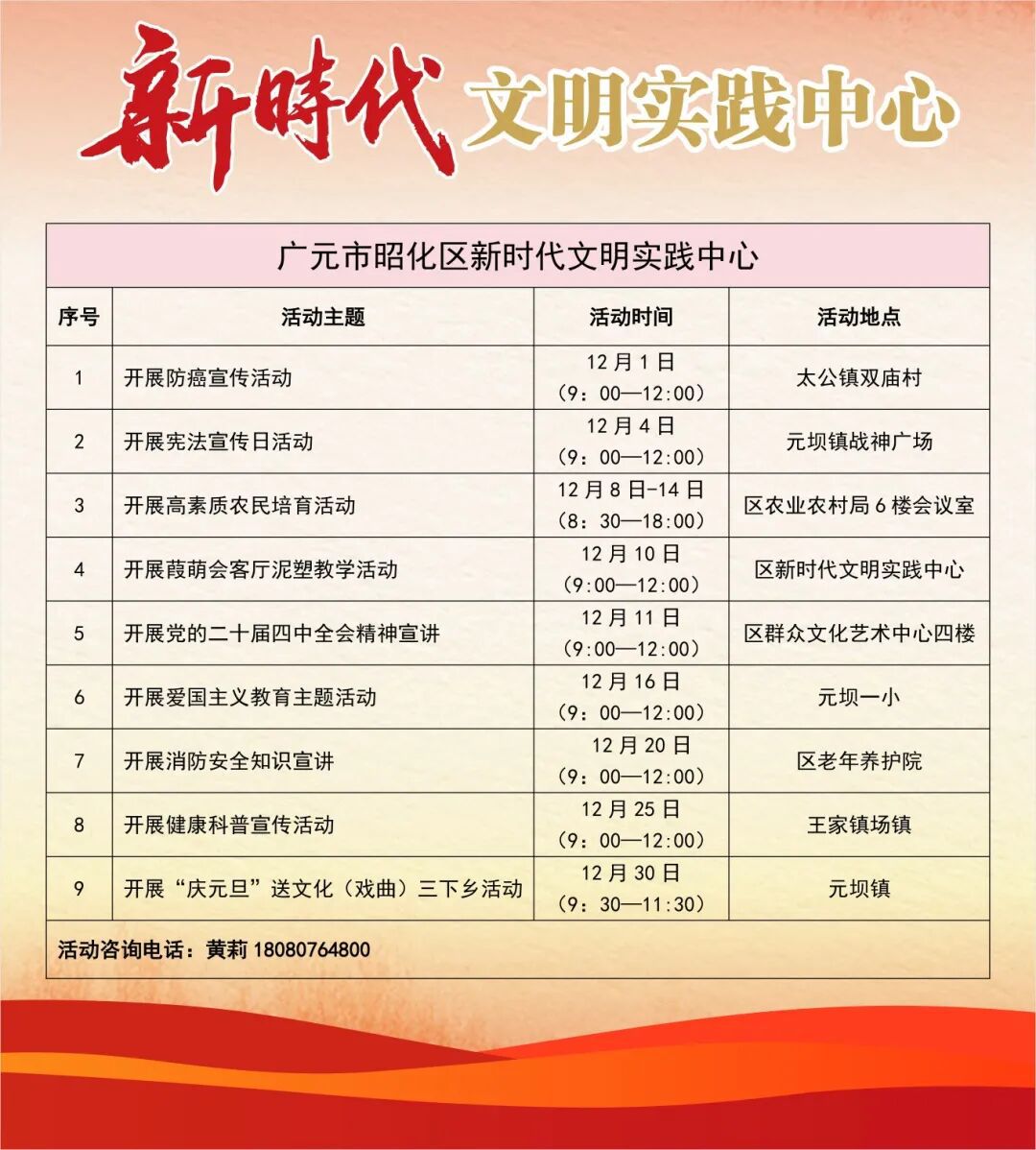 为进一步丰富群众精神文化生活,推动新时代文明实践工作深入开展,区新时代文明实践中心(所、站)精心策划汇总了一系列文化艺术、科普宣传等主题鲜明、内容丰富的文明实践活动。现将12月重点文明实践活动安排预告如下: