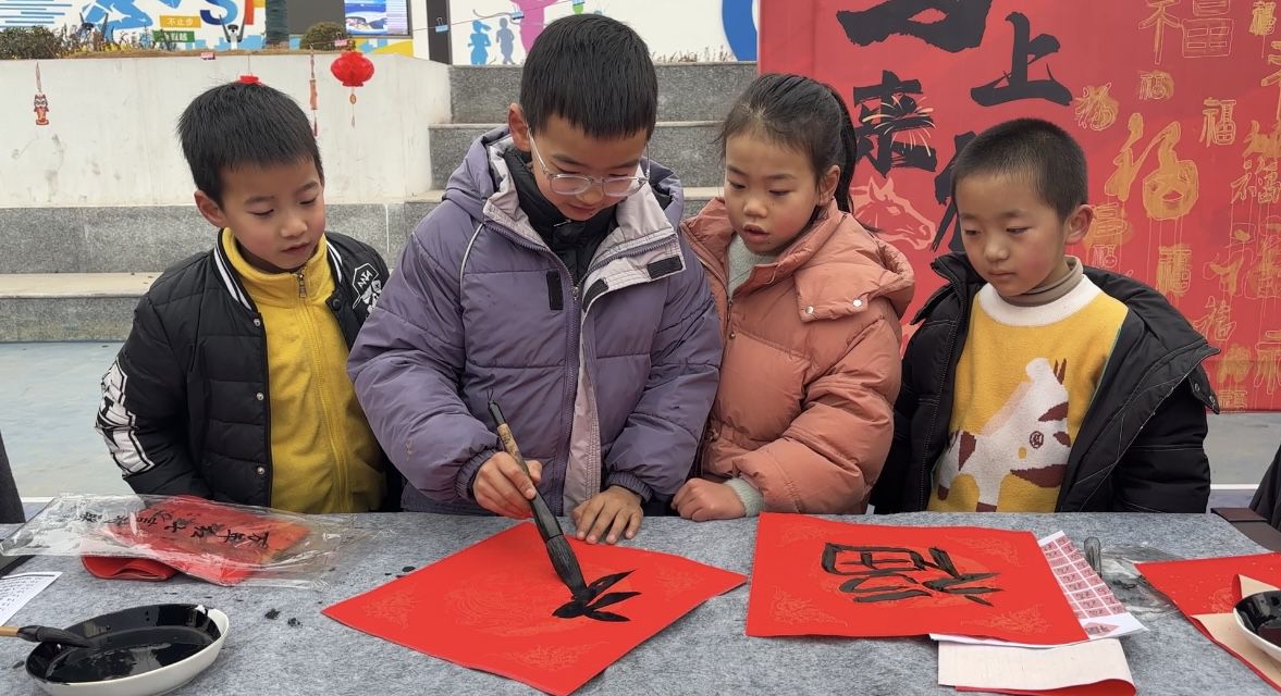活动尚未正式开始,广场上已挤满了闻讯而来的群众。红彤彤的宣纸整齐铺展在长桌上,墨汁研磨得醇厚香浓,五位书法老师不一会儿便被群众层层围拢。活动由书法老师开笔写下首个“福”字拉开序幕。小朋友们纷纷在百福签到墙上挥毫,共同绘就“百福图”。