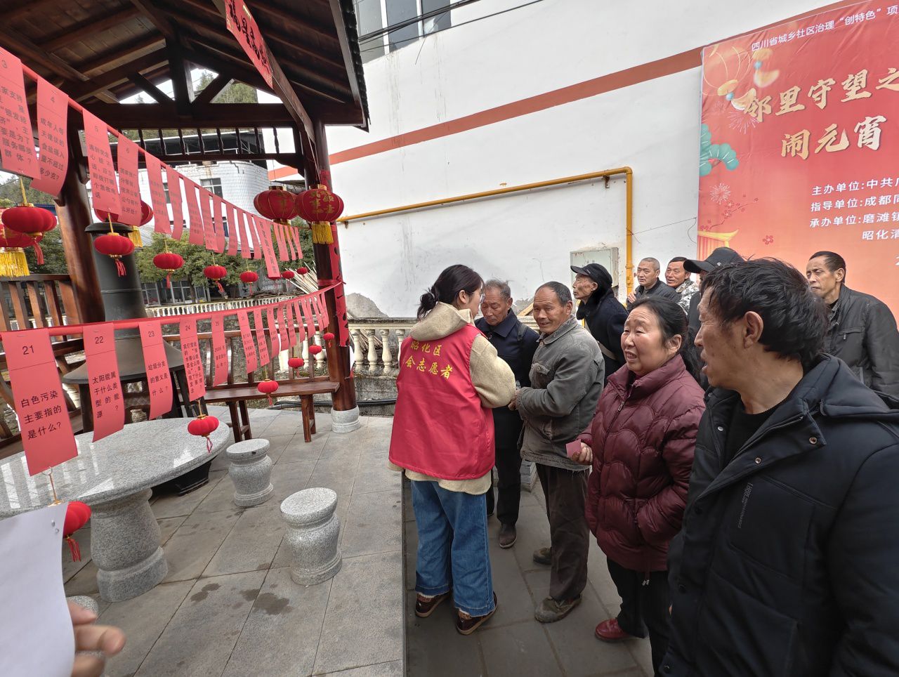 与此同时,一旁的猜灯谜区域也人头攒动,热闹非凡。一条条五颜六色的谜语纸条悬挂在空中,内容涵盖了传统文化、生活常识、科普知识、党史知识等多个方面,既具娱乐性,又具知识性。居民们或三五成群讨论谜底,或独自凝神静思,你一言我一语,不时传出阵阵欢笑声和成功猜出谜底的欢呼声。猜到谜底的居民还能获得一份精美的小礼品,更增添了活动的趣味性和吸引力。