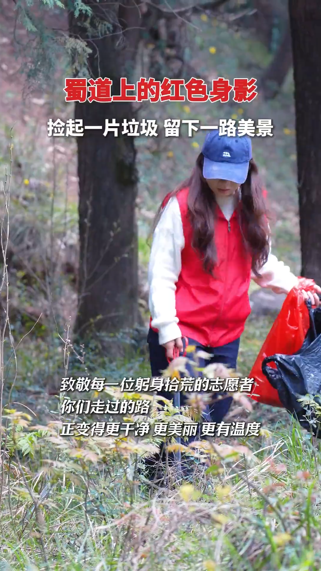蜀道上的红色身影 捡起一片垃圾 留下一路美景