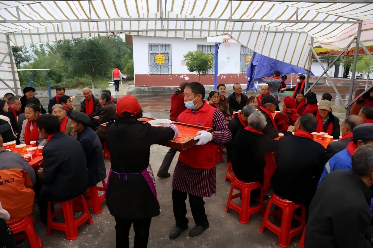 活动在热烈欢腾的腰鼓表演中拉开序幕,随后“男声独唱、川剧变脸、快板小品”等一个个节目轮番上演,现场气氛热烈,老人们围坐桌旁,边嗑瓜子边看演出,不时传来一阵阵热烈掌声。精彩纷呈的文艺汇演结束后,志愿者们化身坝坝宴“服务员”,为老人们送上一条条大红围巾,端菜、传菜,用实际行动践行孝亲敬老美德。